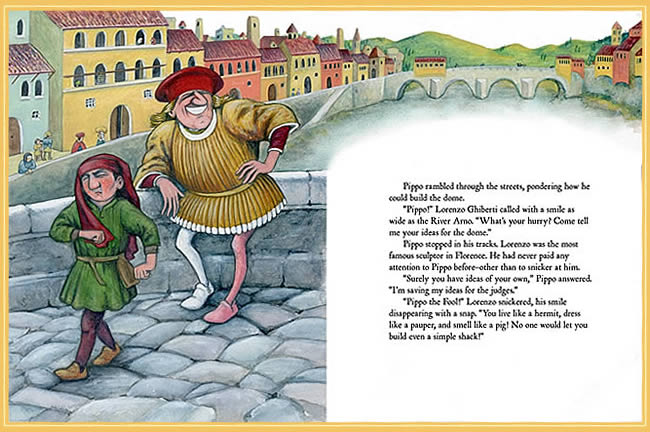 School Library Journal, Starred Review ---- A slice of history is served a la Florentine for the delectation of curious minds in this revealing portrait of genius Filippo Brunelleschi...Fern's humorous text brings Pippo's crabby persona to cranky life as he ponders, sketches, schemes, calculates, and competes his way to a glorious completed dome and lasting fame...This neat blend of fact and fiction is as seamlessly constructed as the intricate brickwork of the dome on the Duomo. |